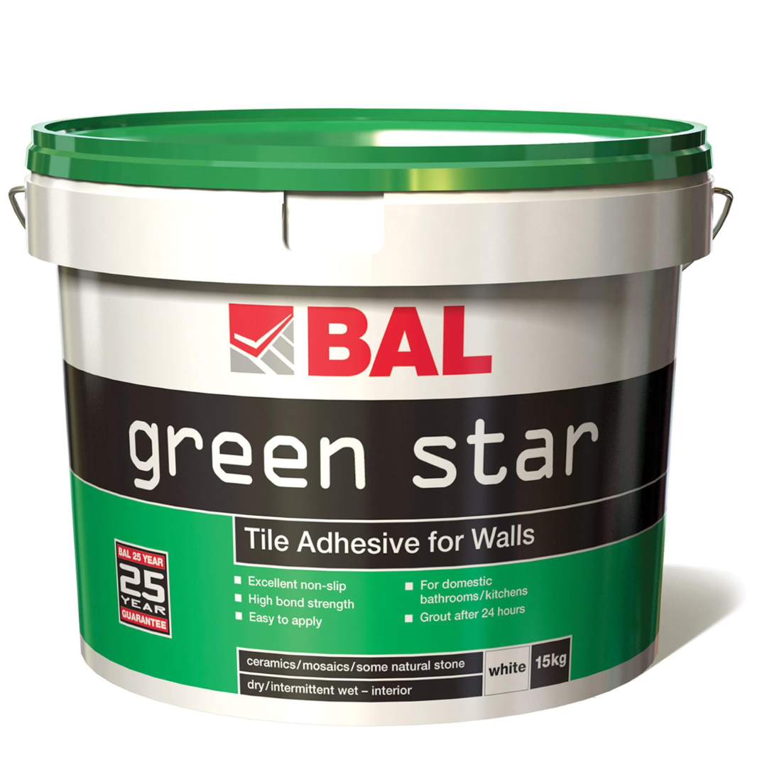 BAL Green star - A general-purpose, ready-mixed adhesive for ceramics (up to 300x300mm) and mosaics in dry or wet interior areas, with good non-slip and extended open time (30 mins).